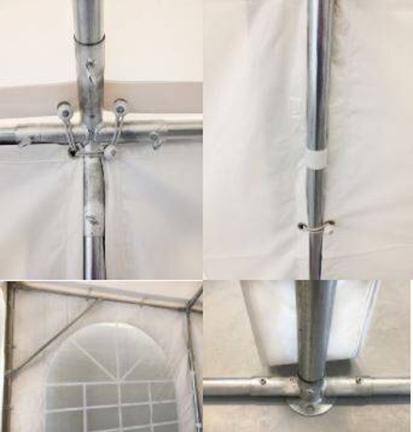 - Zijwanden worden aan elkaar bevestigd met elastieken achter flappen die van het dakzeil naar onder komen (volledig wind- en waterdicht!). Het voordeel hiervan is dat elastieken meegeven wanneer de wind op de zijwanden zitten; bij ritssluitingen of velcro verbindingen is dit niet het geval ! Zwakke ritsen scheuren wanneer de wind erop zit en velcro verbindingen gaan open
